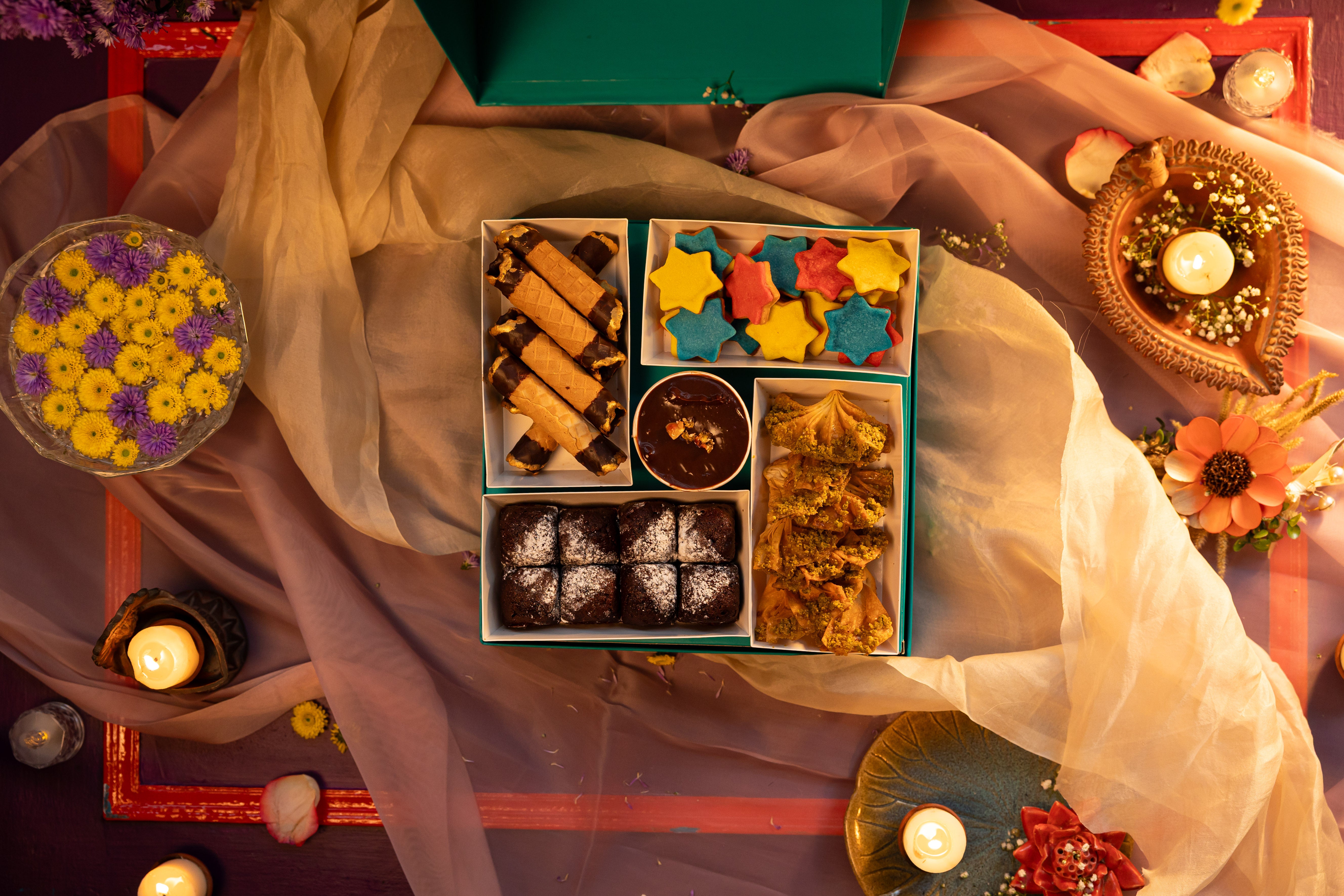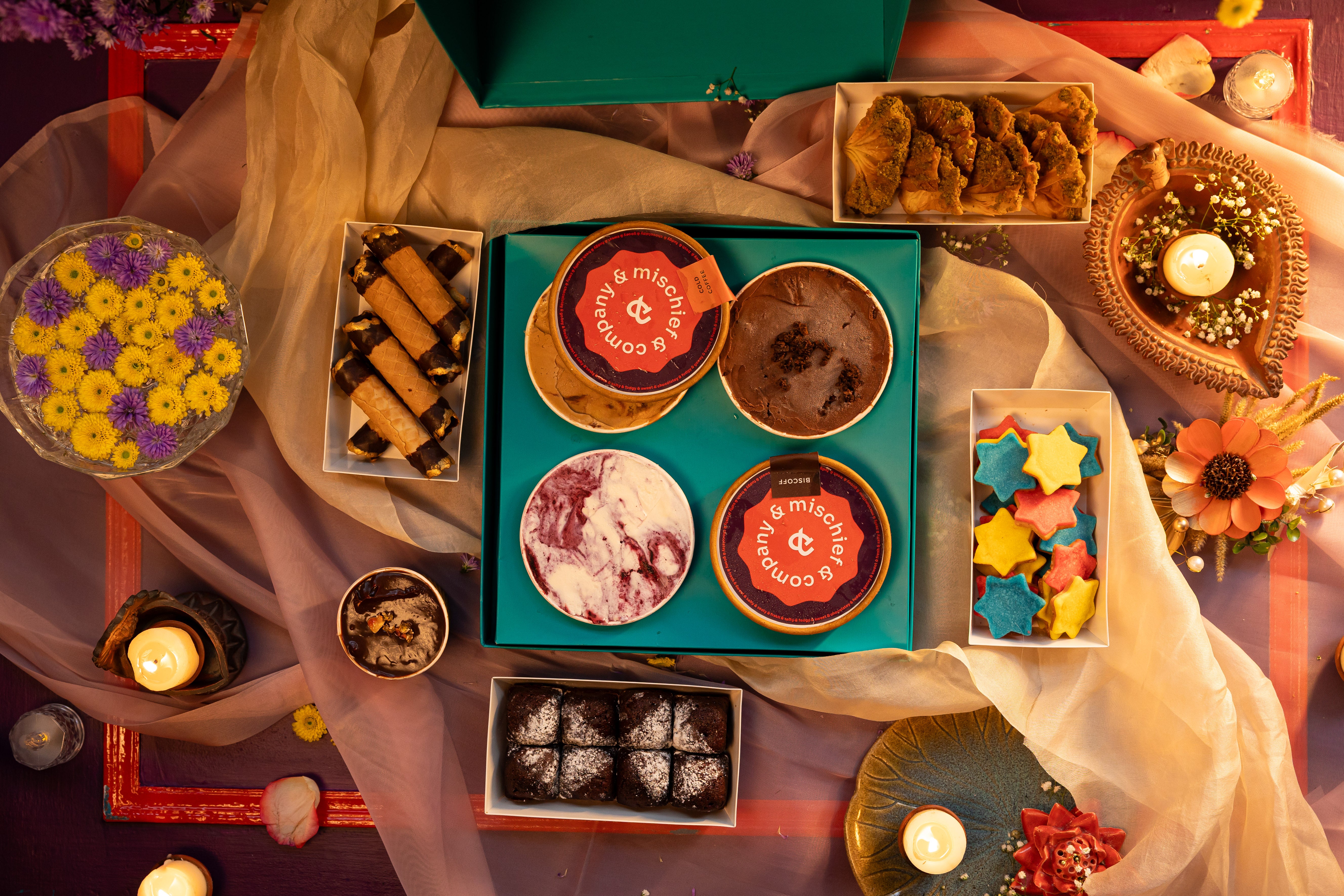 The unbeatable hand of Diwali. A two-layered fondue box packed with pure indulgence — 7 varieties of handcrafted sweet snacks (cookies, brownies, pound cake squares, mini choco-chip cookies, star cookies, filo fans, and cone-oil wafers) plus 4 x 250ml tubs of our best damn ice cream. Complete with a Mischief fondue set, this is the grandest box of the season — lavish, playful, and impossible to top.